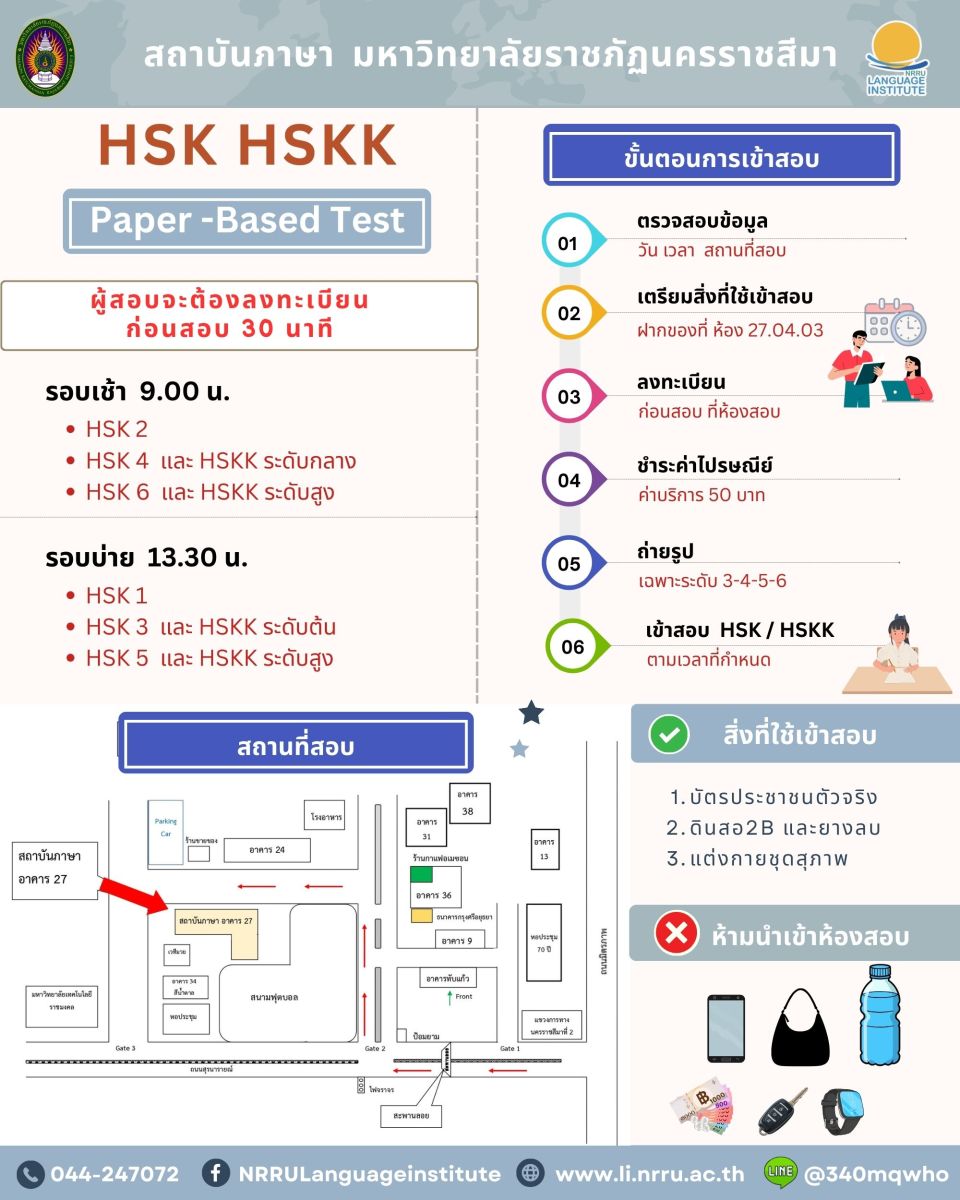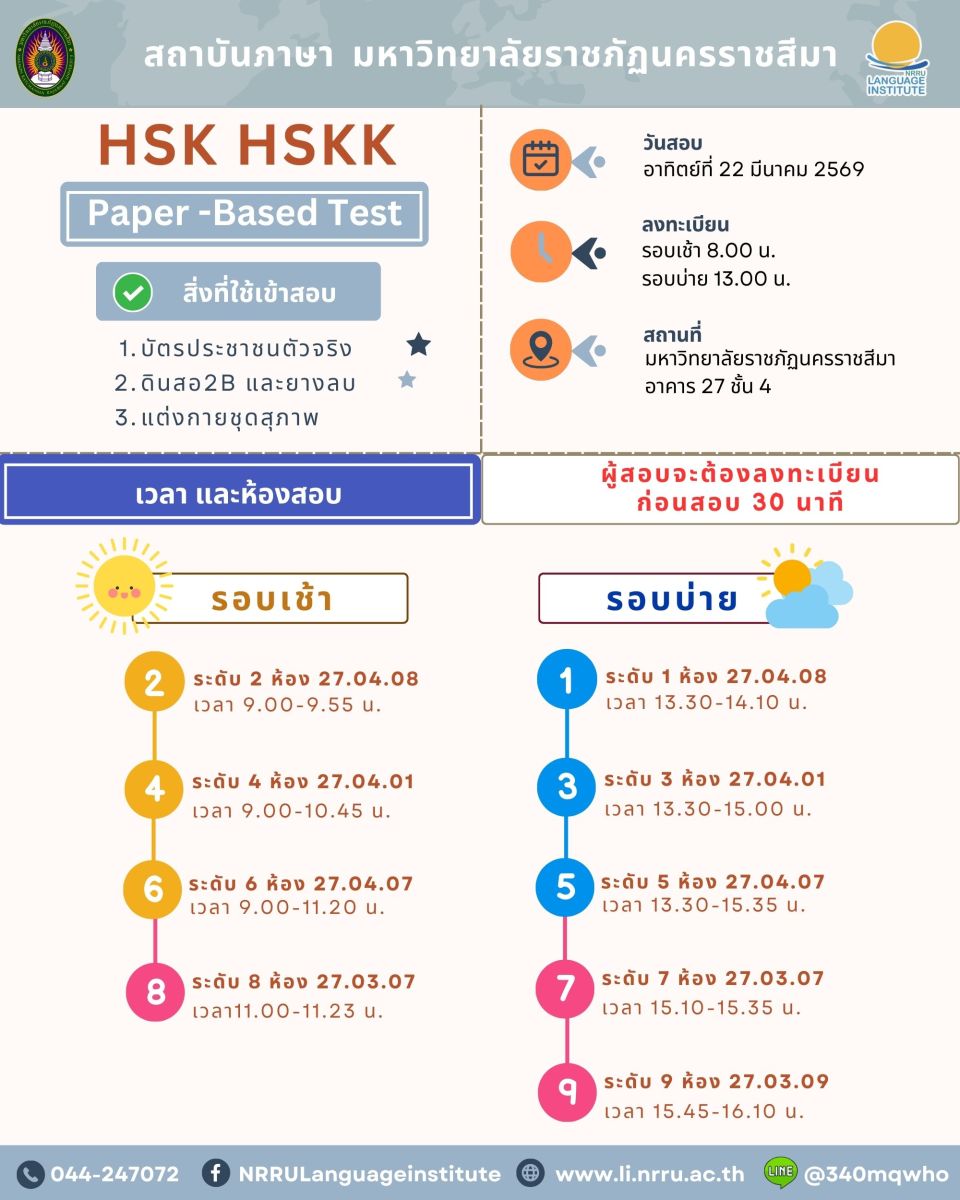 #HSKTEST ประกาศรายชื่อผู้สอบ HSK HSKK วันสอบ: อาทิตย์ที่ 22 มีนาคม 2569 เวลา: ลงทะเบียนก่อนสอบ 30 นาที รอบเช้า 9.00 น. / รอบบ่าย 13.30 น. สถานที่: มหาวิทยาลัยราชภัฏนครราชสีมา อาคาร 27 * หมายเหตุ สงวนสิทธิ์การคืนเงินค่าสมัครสอบในทุกๆ กรณี . ตรวจสอบข้อมูล ที่ลิงก์ https://drive.google.com/drive/folders/1ENtEKV_GjKKKi9fdgGkcse1gtBAw6Lfp?usp=sharing 1. การเตรียมตัวสอบ 2. ห้องสอบ 3. ใบรายชื่อ ------------------------------------------------- ติดต่อ สถาบันภาษา มหาวิทยาลัยราชภัฏนครราชสีมา FB : https://www.facebook.com/NRRULanguageinstitute e-mail : language@nrru.ac.th Website : https://li.nrru.ac.th Tel. : 044-247072